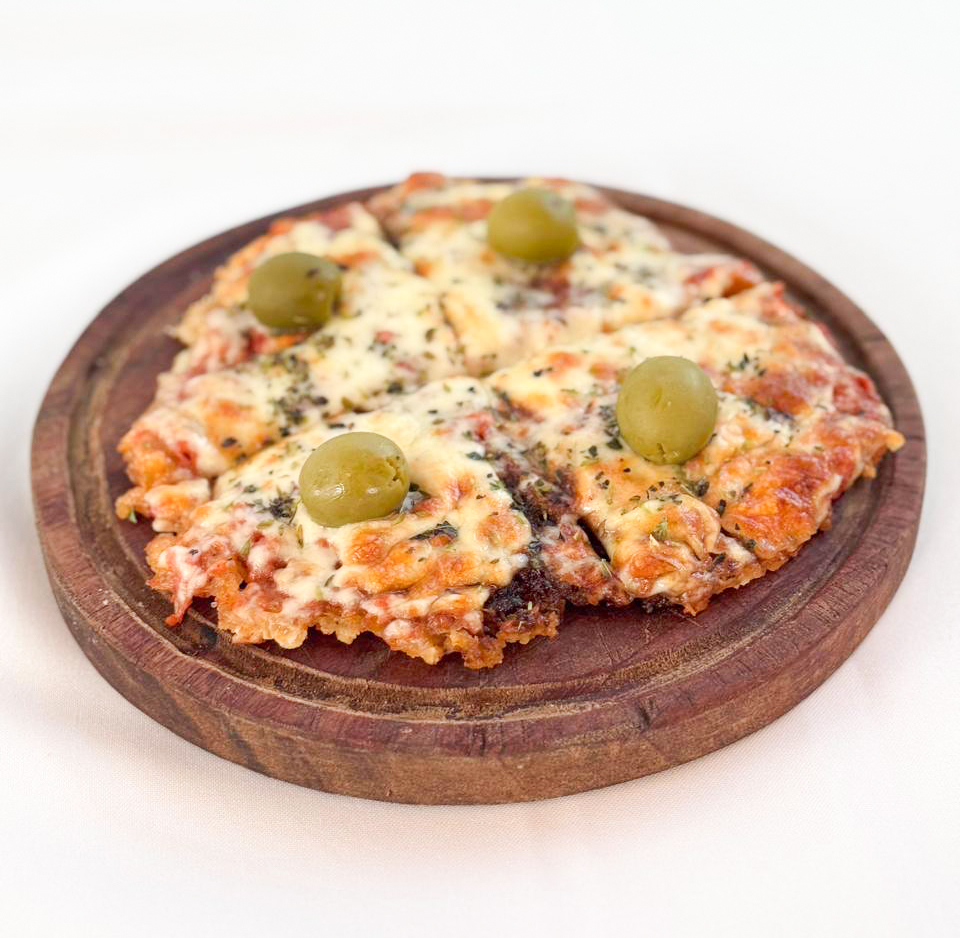 Disco de almidon de mandioca y queso parmesano, con muzzarella y tomate orgánico.